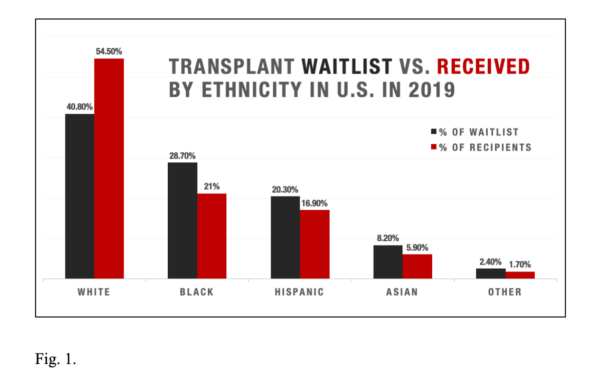 While allowing living directed donations between biologically or emotionally unconnected donors and recipients may increase the pool of organ donors, opponents of directed living donation argue that allowing the general public to select “worthy” applicants exacerbates discrimination. The idea that allowing donors to choose their recipients would significantly increase the donor pool and thus positively impact society is overoptimistic and flawed. In the past, moral problems with directed donations have caused uproar and protest from the public. For example, in 1998, a transplant center in the UK accepted an organ from a member of the KKK with the stipulation that it could only be donated to a white person [6]. With such events, the United Network for Organ Sharing (UNOS) declared that “donation of organs in a manner which discriminates for or against a class of people based on race, national origin, religion, gender, or similar characteristics is unethical” and would not be accepted by transplant professionals [6]. However, the unconscious bias of doctors and physicians already causes certain minority groups a significant disadvantage in terms of receiving organs. In 2019, African Americans made up 3 in 10 candidates on the organ waitlist, but only comprised 21% of transplant recipients as seen in Figure 1. The key observation is whites were the only demographic receiving a disproportionate number of organ transplants relative to their representation on the waitlist.